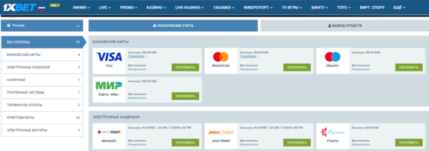 Чтобы сделать ставку, необходимо иметь деньги на счёте. В букмекерской конторе доступны несколько способов пополнения депозита: